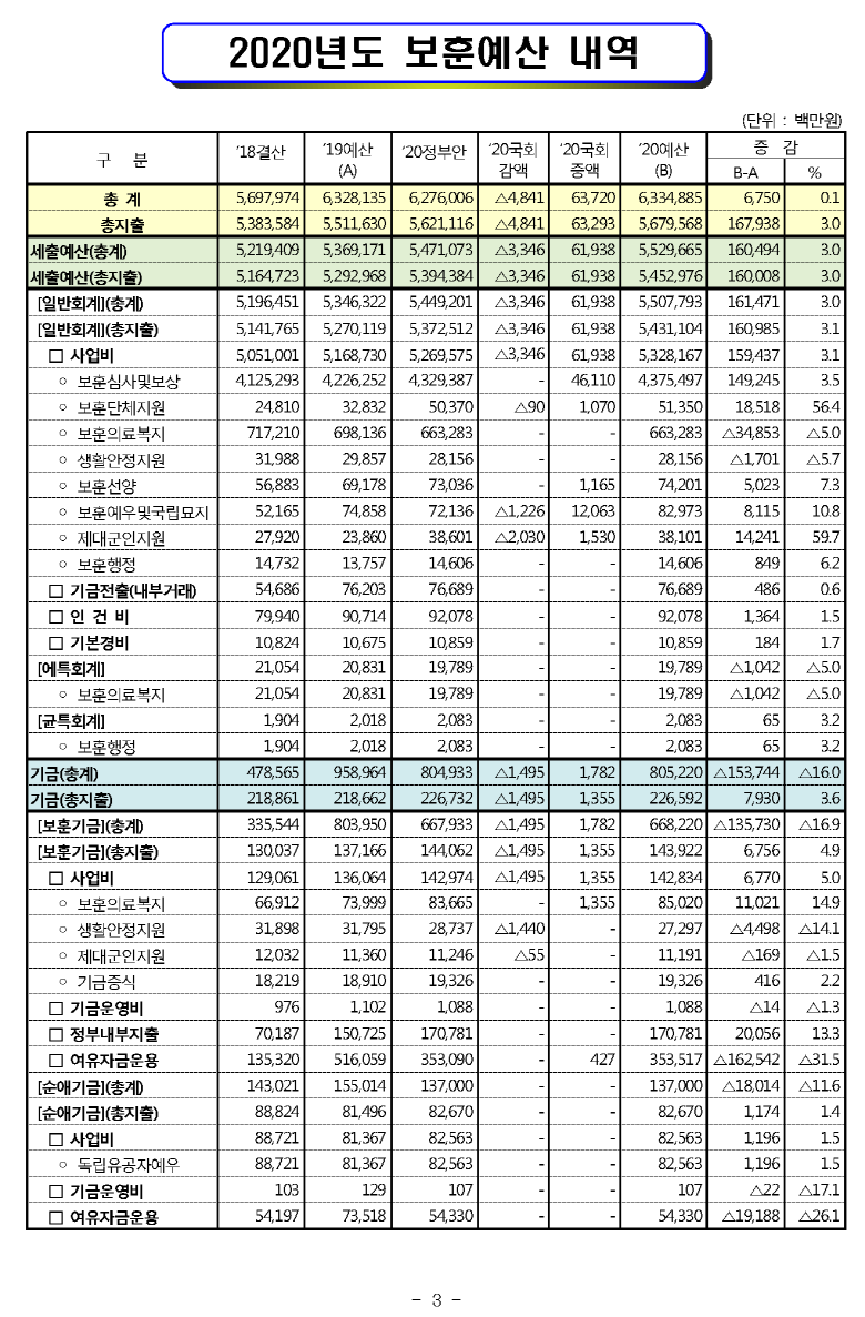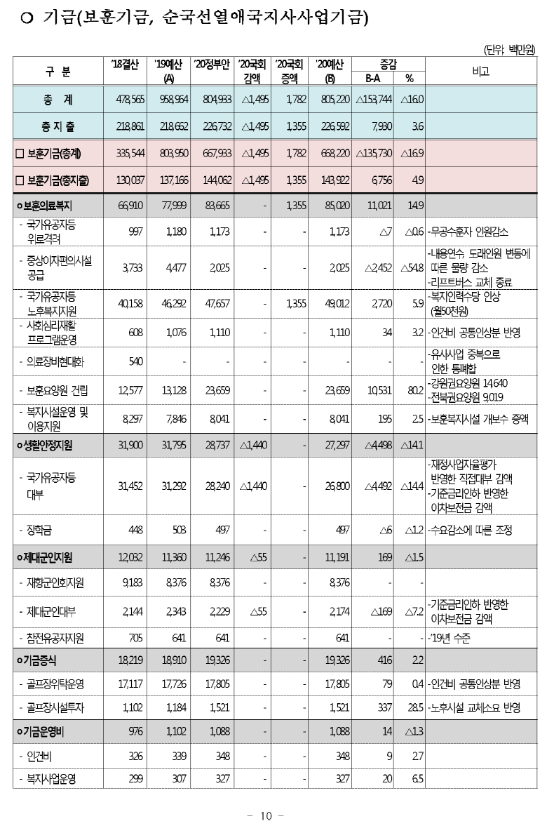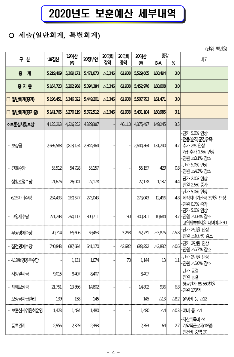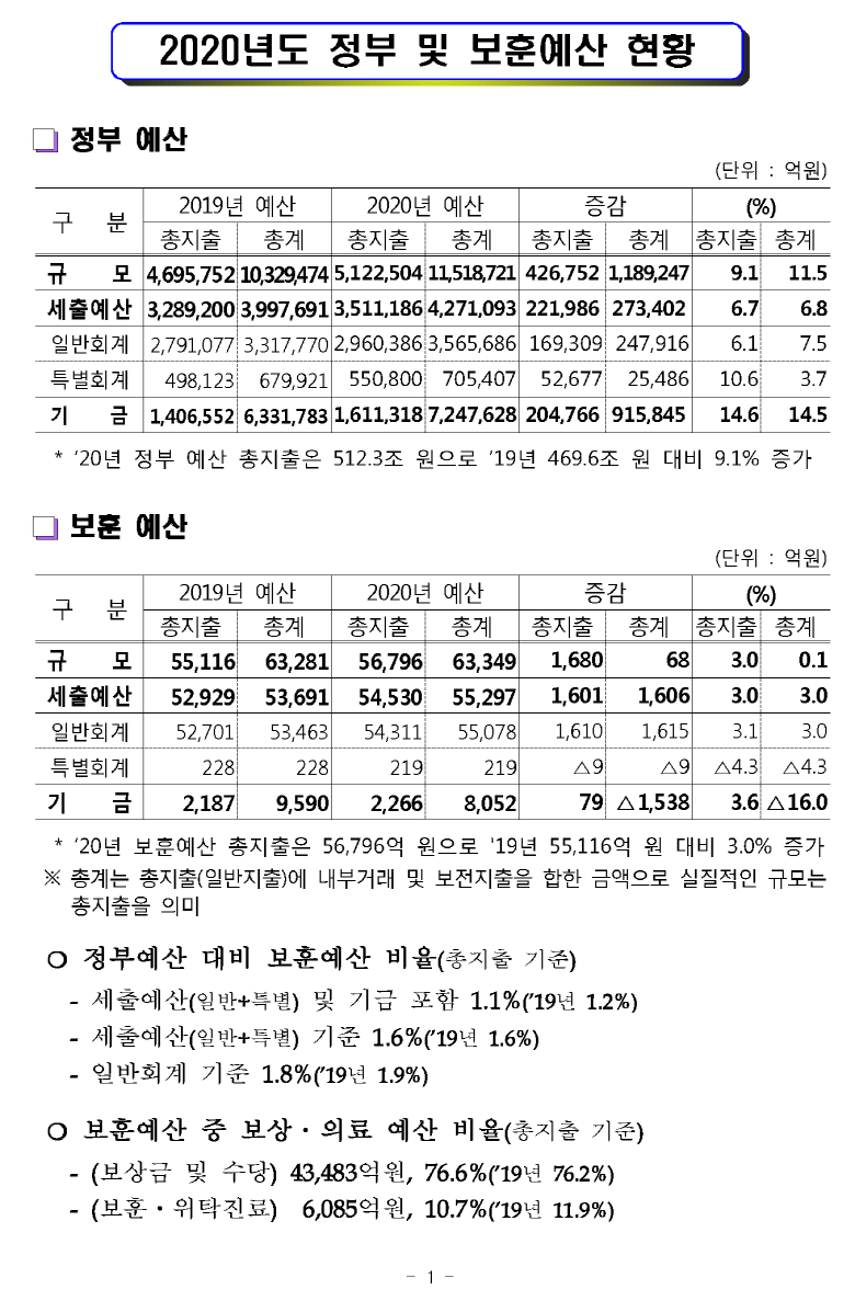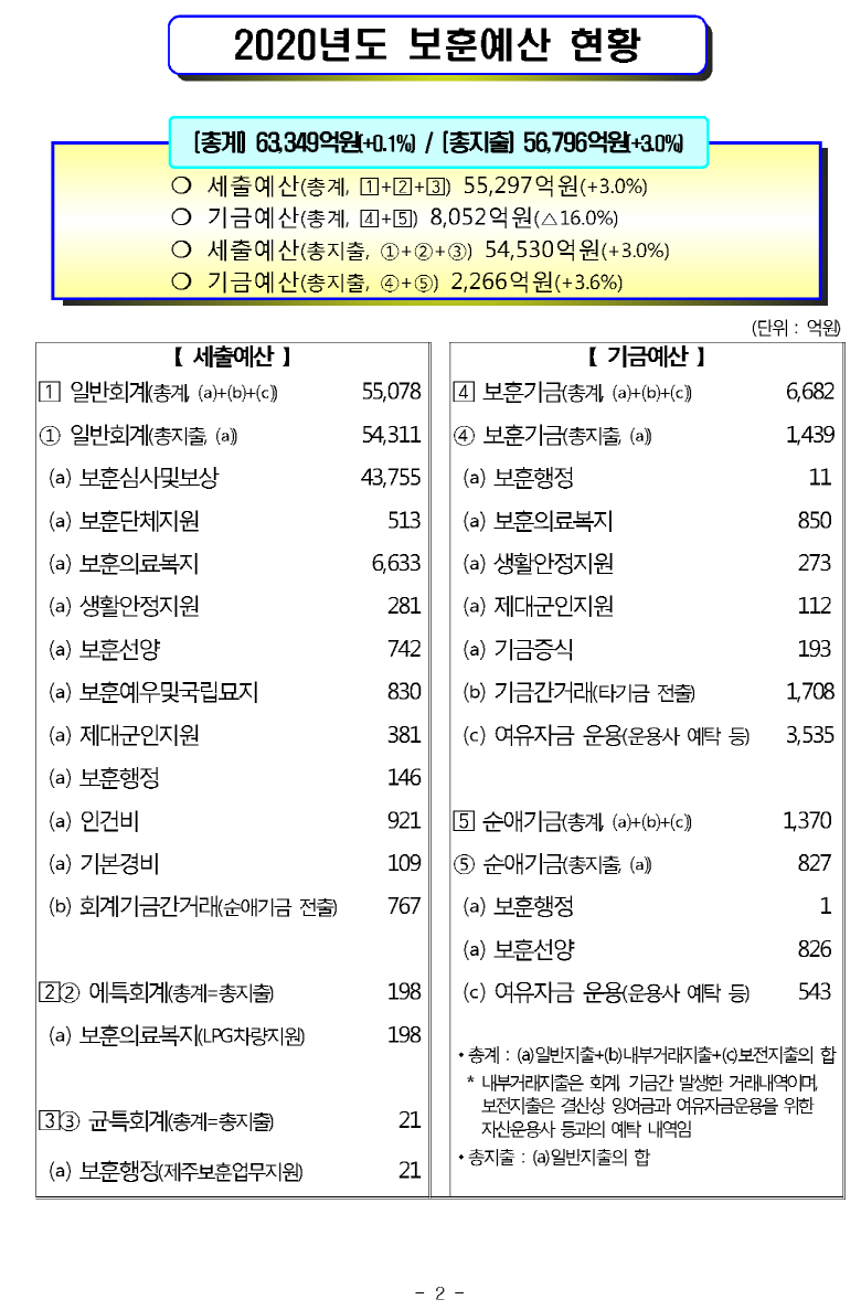 [현황] 2020년도 보훈예산 편성 현황 (보훈급여금,보훈보상금,보훈연금등)