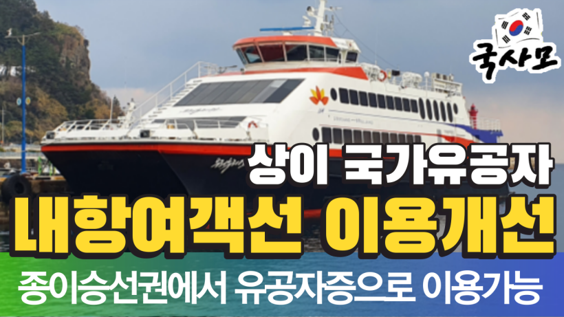 ㅇ 이에 따라 상이 국가유공자면 누구나 소지하고 있는 ‘국가유공자증’ 하나로 여객선을 이용함으로써, 앞으로는 ‘종이 승선이용권’ 발급을 위해 지방 보훈관서를 방문하지 않아도 되고, 분실이나 훼손 우려도 없게 변경되었다.