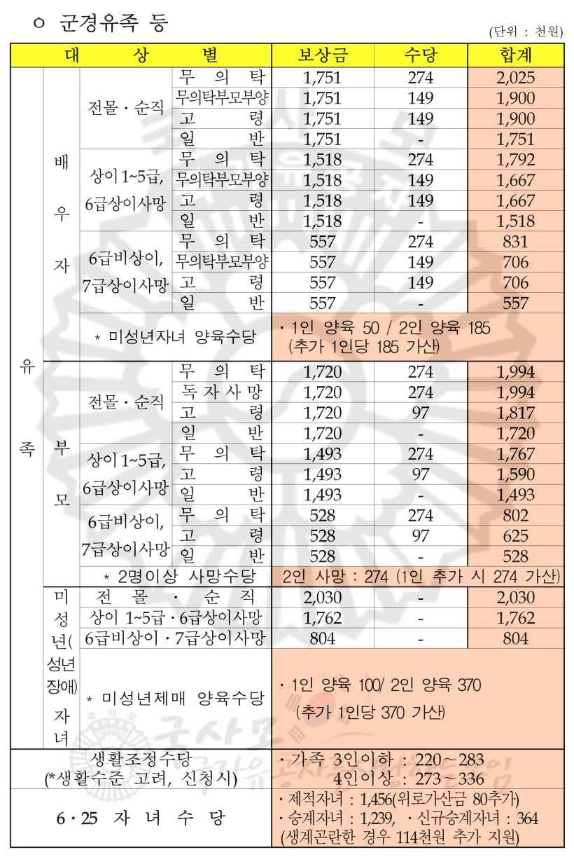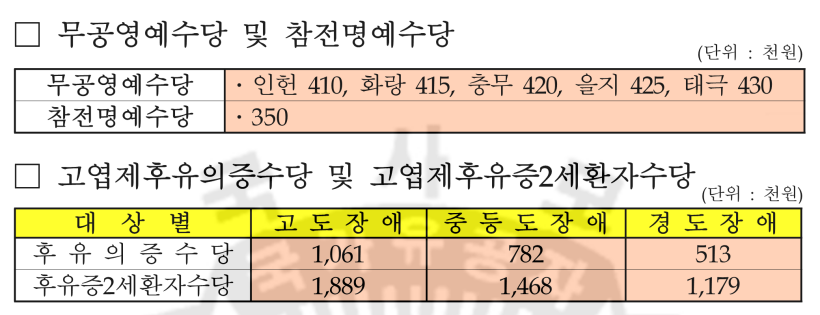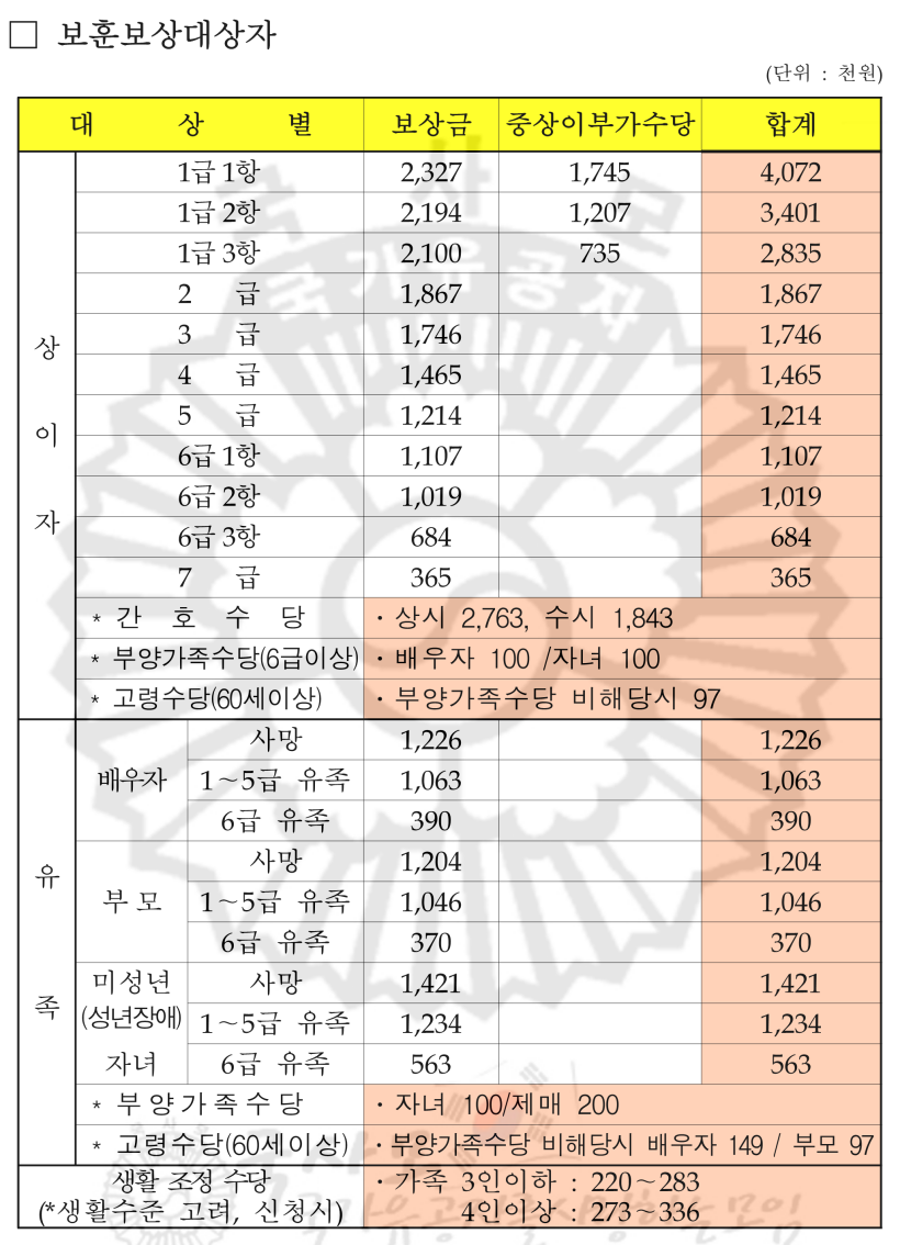 보훈급여금, 간호수당, 중상이부가수당, 6.25 자녀수당, 고엽제후유의증 수당등 보훈보상금과 수당은 평균 5% 인상되었습니다.