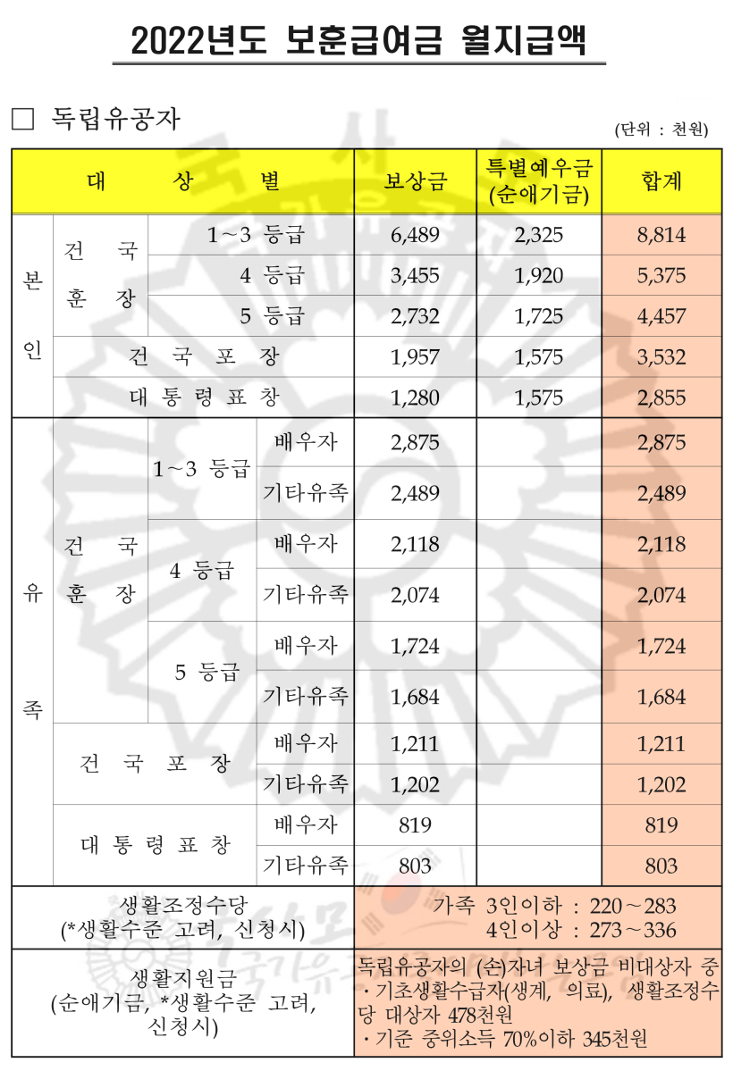 국가유공자 보훈대상자 참전유공자 2022년 보훈보상금 급여 보훈연금 수당 월 지급액표, 보훈급여금 5% 인상, 참전명예 무공영예수당 월 1만원 인상, (보훈급여금,보훈연금,보훈수당,연금표,유..