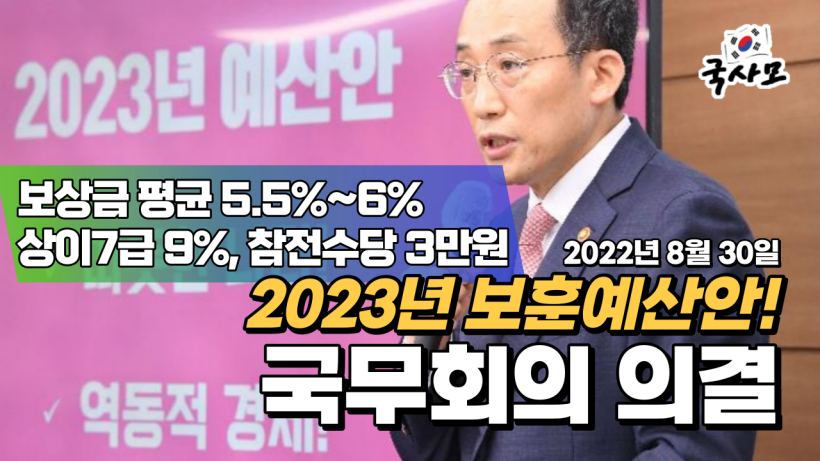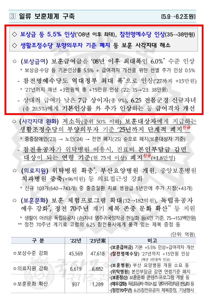 2023년 보훈예산안,2023년 국가유공자 보훈급여금 보훈보상금 보훈연금 인상,국가보훈처,국가유공자,보훈대상자,참전유공자,참전명예수당,무공영예수당,2023년 보훈보상금,2023년 보훈연금,2023년