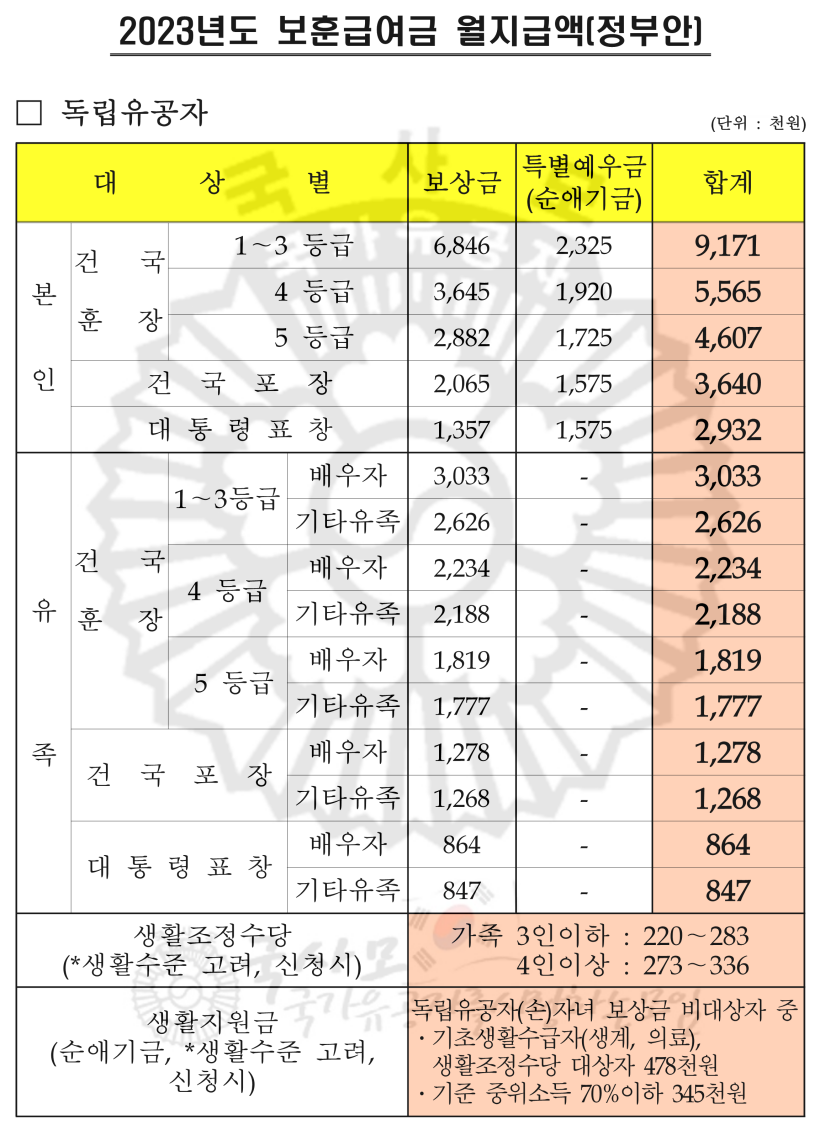 [ 공지사항 : 본 자료는 링크공유만 가능하며 자료의 외부 무단전재 및 무단사용은 허용하지 않습니다. 본 2023년도 보훈급여금 월지급액(안)은 정부안에 근거한 자료로서 2022년 12월 초 국회 예산안 최종확정 시 일부 변동될수 있습니다. 지급액은 일부항목에서 +(-)1,000원의 편차가 있을수 있으니 참고하시기 바랍니다. ]