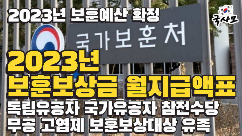2023년 보훈예산안,2023년 국가유공자 보훈급여금 보훈보상금 보훈연금 인상,국가보훈처,국가유공자,보훈대상자,참전유공자,참전명예수당,무공영예수당,2023년 보훈보상금,2023년 보훈연금,2023년 국가유공자연금,국가보훈대상자,상이군경,보훈,공상군경,보훈혜택,참전용사혜택,국가유공상이자,전상수당,참전유공자수당,참전명예수당,간호수당,생활조정수당,전몰유자녀수당,제적자녀,승계자녀,신규승계자녀,6․25자녀수당,고령수당,무공명예수당,고엽제수당,유족연금,보훈보상대상자,부양가족수당,중상이부가수당,국가유공자연금표,전물유족,625유자녀수당,고엽제수당,참전유공자,유족보상금