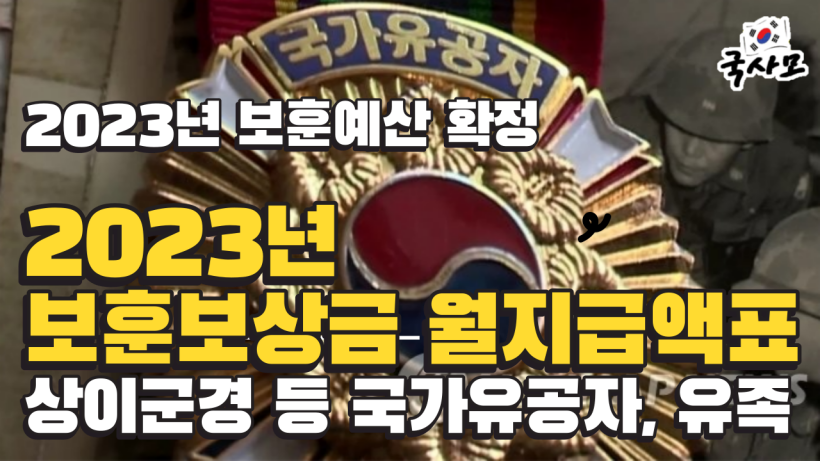 2023년 보훈예산안,2023년 국가유공자 보훈급여금 보훈보상금 보훈연금 인상,국가보훈처,국가유공자,보훈대상자,참전유공자,참전명예수당,무공영예수당,2023년 보훈보상금,2023년 보훈연금,2023년 국가유공자연금,국가보훈대상자,상이군경,보훈,공상군경,보훈혜택,참전용사혜택,국가유공상이자,전상수당,참전유공자수당,참전명예수당,간호수당,생활조정수당,전몰유자녀수당,제적자녀,승계자녀,신규승계자녀,625자녀수당,고령수당,무공명예수당,고엽제수당,유족연금,보훈보상대상자,부양가족수당,중상이부가수당,국가유공자연금표,전물유족,625유자녀수당,고엽제수당,참전유공자,유족보상금