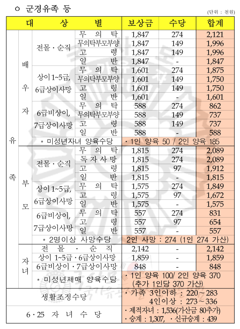2023년 보훈보상대상자, 유족 보훈급여금 월지급액표, 재해부상순직군경 보훈보상금 급여 연금