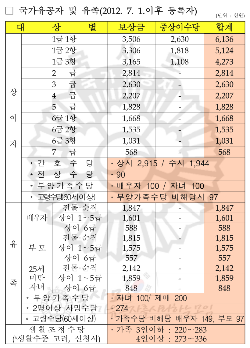 [보훈급여금 월지급액표 전체대상자] 2023년 국가유공자 상이군경 참전유공자 무공수훈자 고엽제후유의증 보훈보상대상자 유족 보훈보상금 급여 수당 월 지급액표 [ 공지사항 : 본 자료는 링크