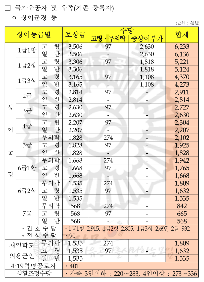 2023년 상이군경 국가유공자, 유족 보훈급여금 월지급액표, 보훈보상금 급여 연금 수당