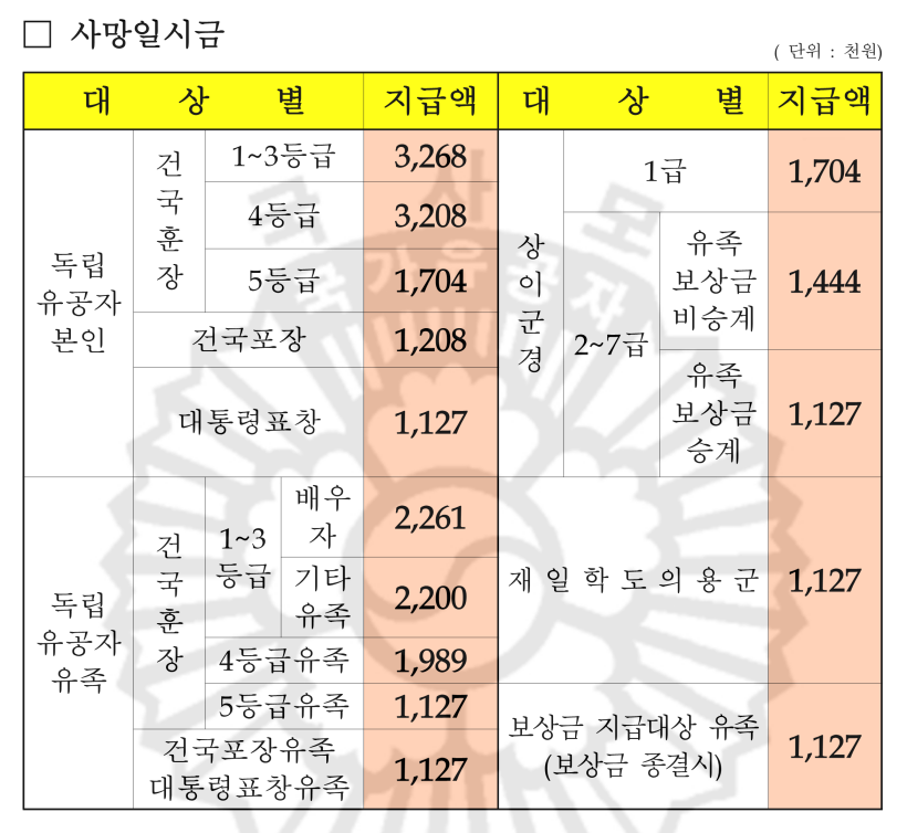 2023년 독립유공자, 유족 보훈급여금 월지급액표, 보훈보상금 급여 연금 수당