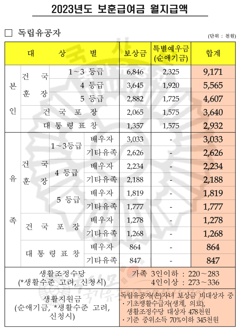공지사항 : 본 자료는 링크공유만 가능하며 자료의 외부 무단전재 및 무단사용은 허용하지 않습니다. 2023년도 보훈급여금 월지급액은 2022년 12월 24일 국회 예산안 통과에 따른 자료로서 일부항목에서 +(-)1,000원의 편차가 있을수 있으니 참고하시기 바랍니다.