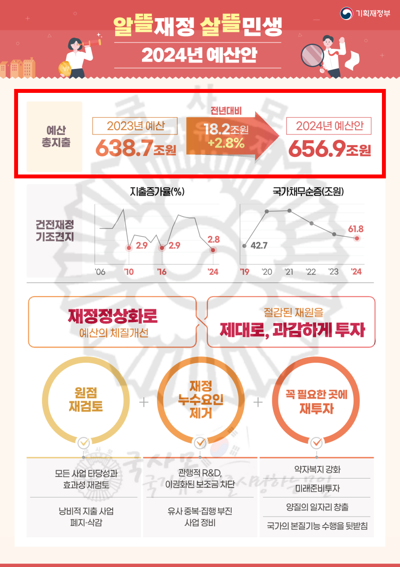 ■ 정부 총예산(2.8% 인상) : 638.7조원 - > 656.9조원
