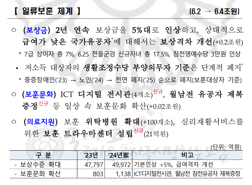 [2024년 보훈예산안 개요] 국가보훈부, 2024년 예산안 6조 3,948억원 편성 > 공지사항 > 국가유공자를