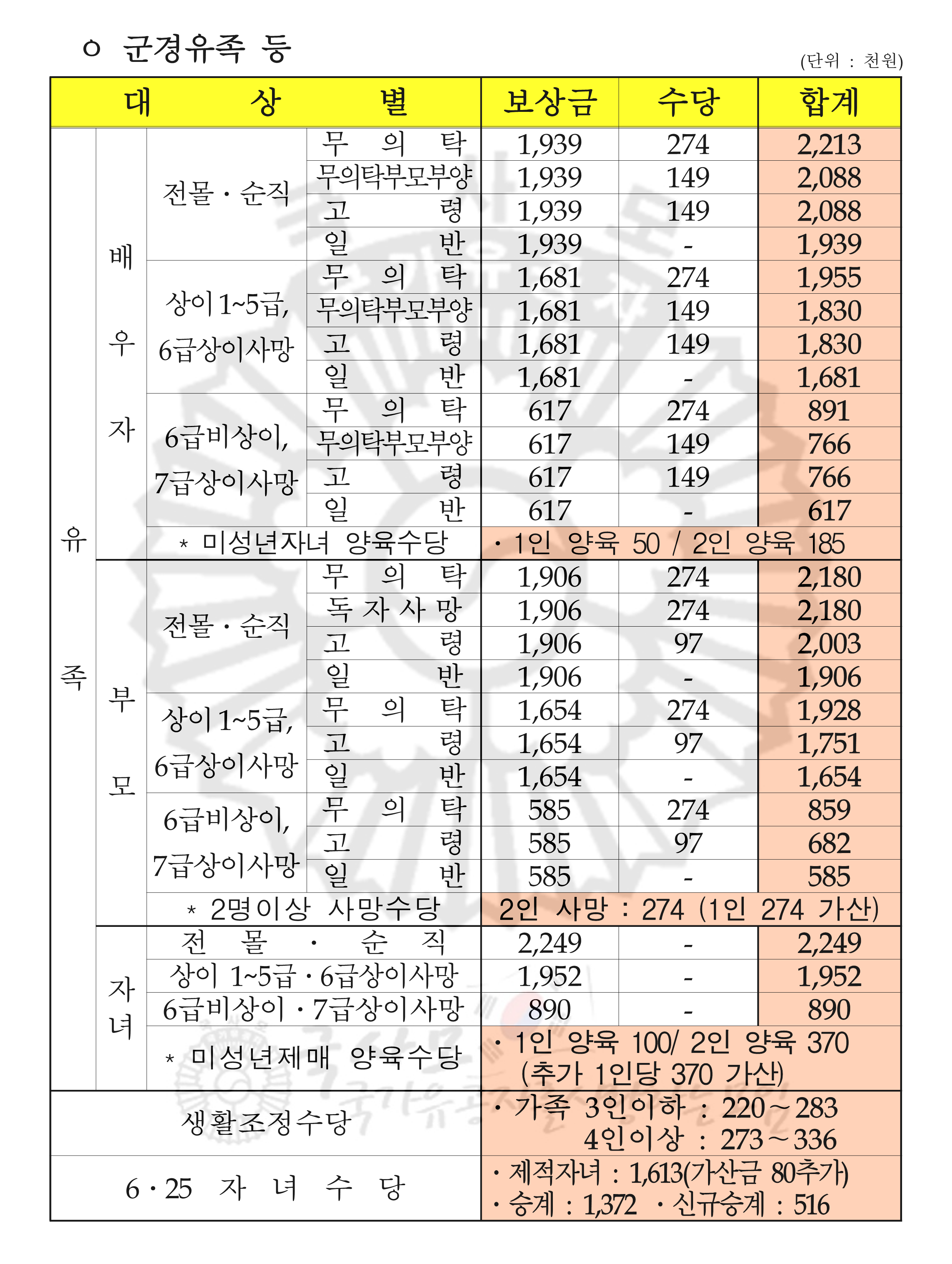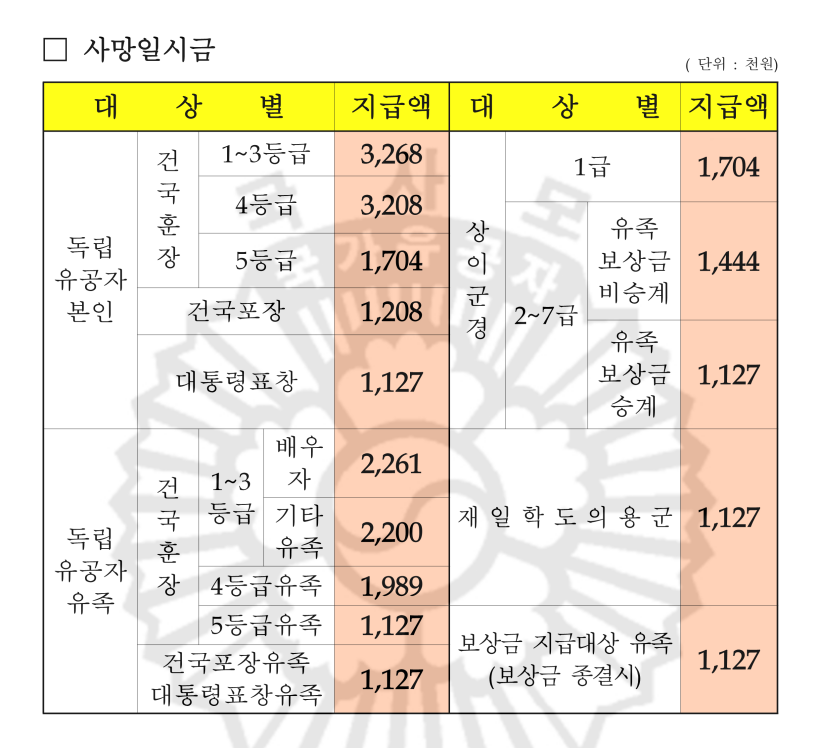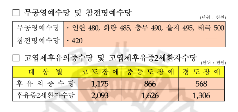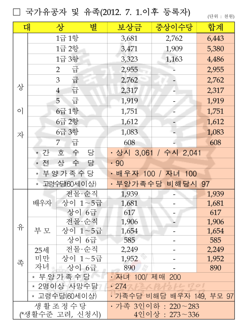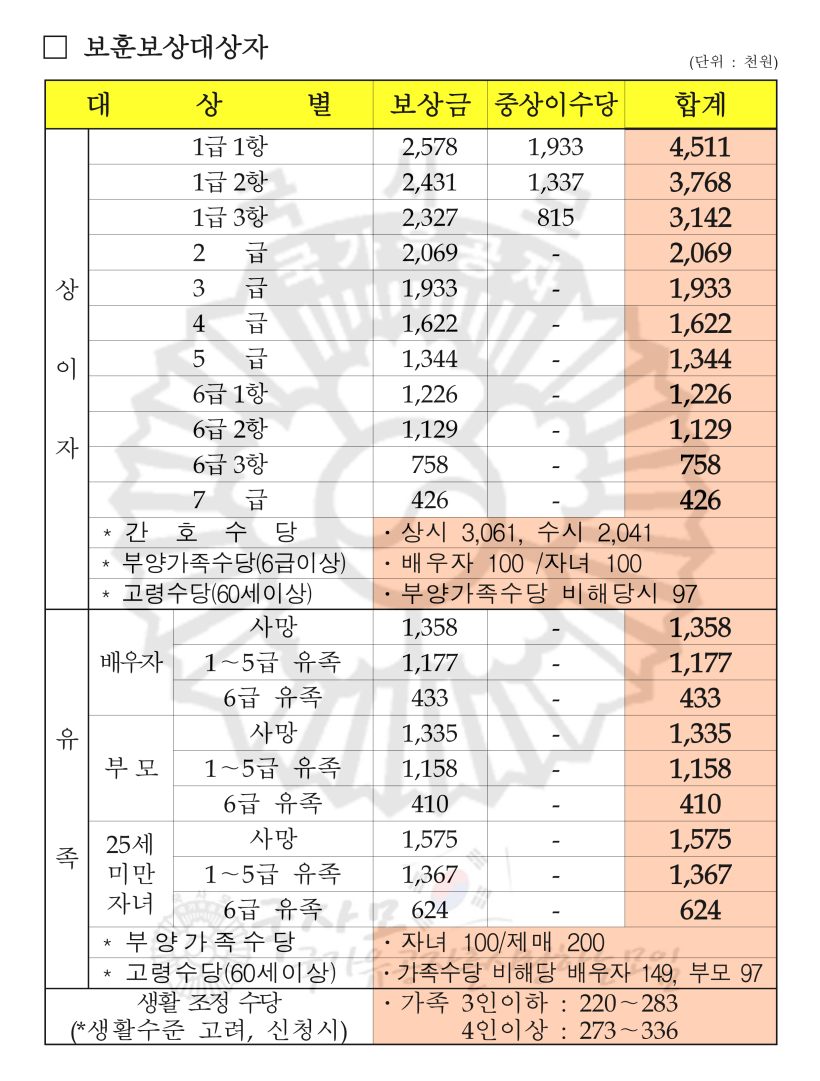 2024년 국가유공자 상이군경 참전유공자 무공수훈자 고엽제후유의증 보훈보상대상자 유족 보훈보상금 급여 수당 월 지급액표