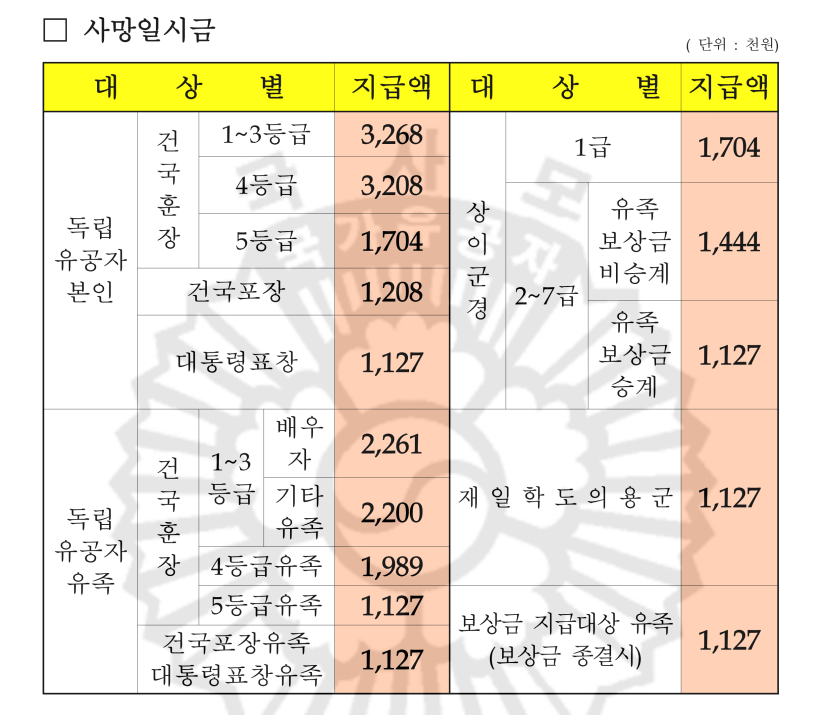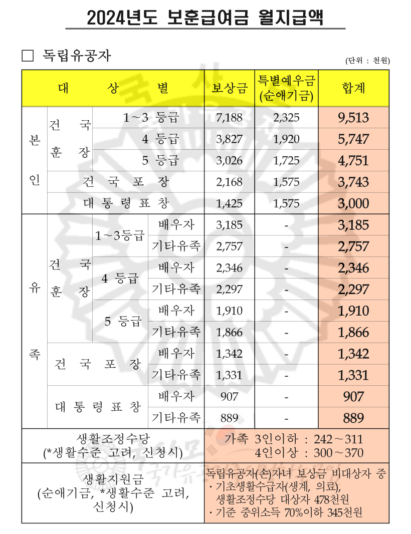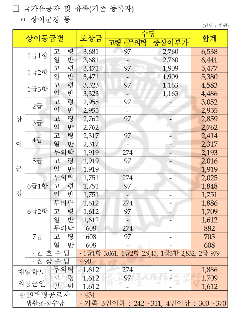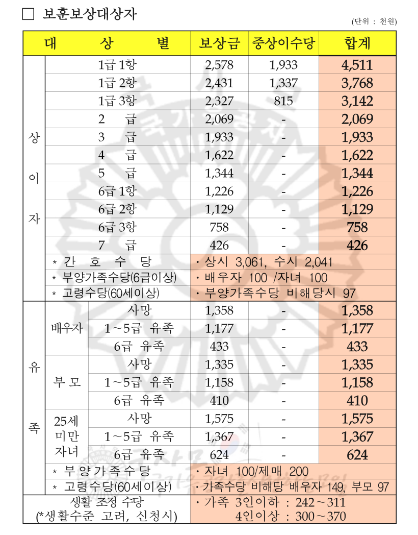2024년 국가유공자 상이군경 참전유공자 무공수훈자 고엽제후유의증 보훈보상대상자 유족 보훈보상금 급여 수당 월 지급액표