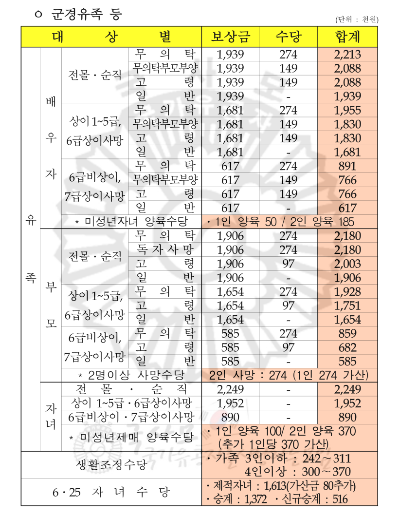▷ 6.25 전몰군경 신규자녀 수당 총 17.5% 인상