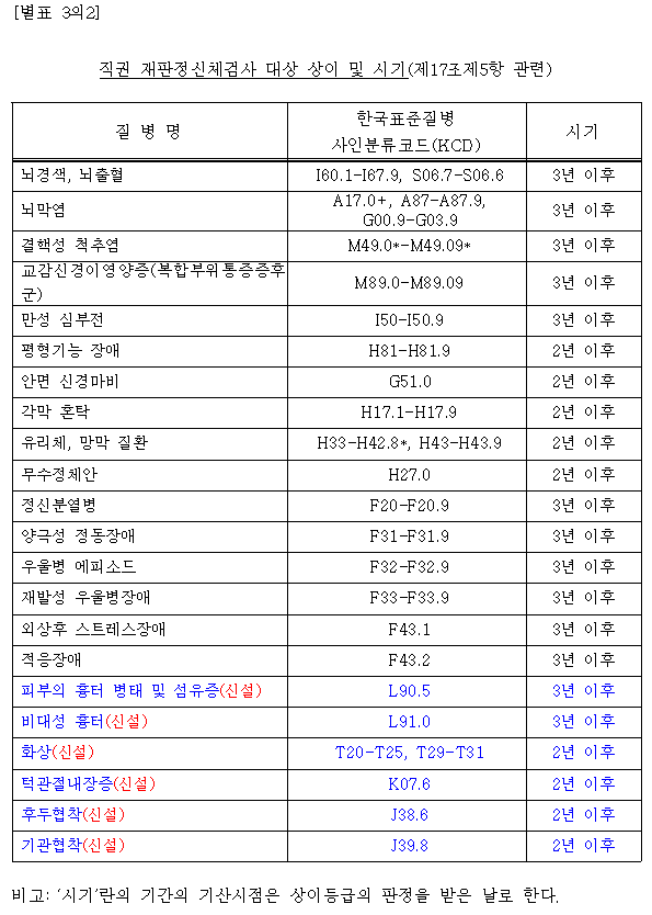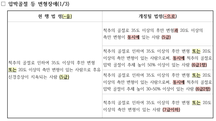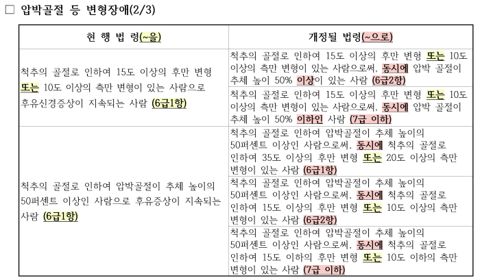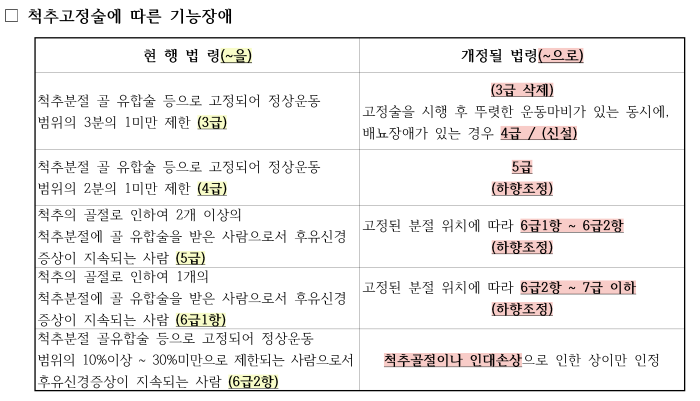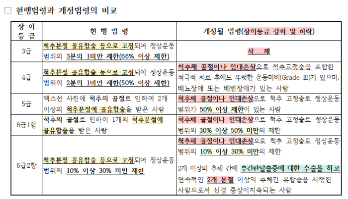 예를 들어 상이처가 허리인 경우 현행법령중 허리와 관련된 상이등급 3급규정은 삭제하였으며 기존 3급규정을 개정법령에서는 4급으로, 현행 4급규정 "척추분절 골유합술 등으로 고정되어 정상운동 범위에 2분의 1미만 제한(50% 이상 제한)을 개정법령에서는 5급규정 "척추체 골절이나 인대손상으로 척추 고정술로 정상운동 법위가 50% 이상 제한이 있는 사람"으로 변경된것을 확인할수 있다.